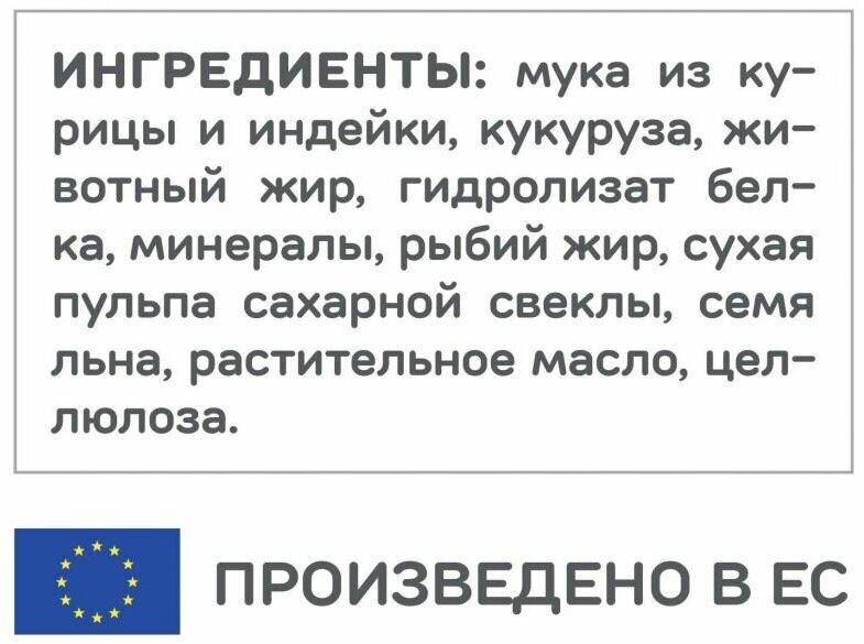 | Состав | курица 29%, общее содержание мяса домашней птицы 45%; мука из курицы и индейки, кукуруза, животный жир, гидролизат белка, минералы, рыбий жир, сухая пульпа сахарной свеклы, семя льна, растительное масло, целлюлоза |