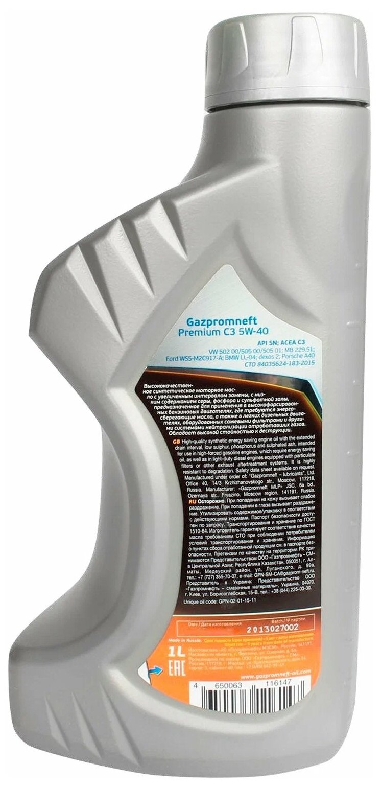 Gazpromneft Premium С3 (Классификация SAE:5W-40, Упаковка:1л)