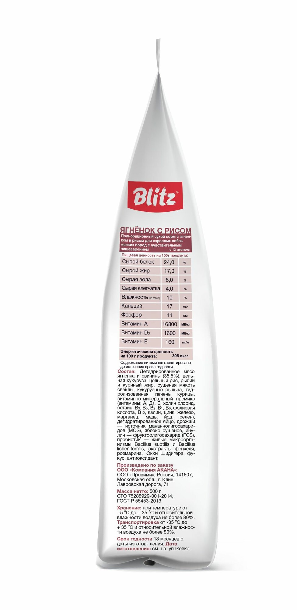BLITZ корм для собак мелких пород Ягненкок с рисом 500г