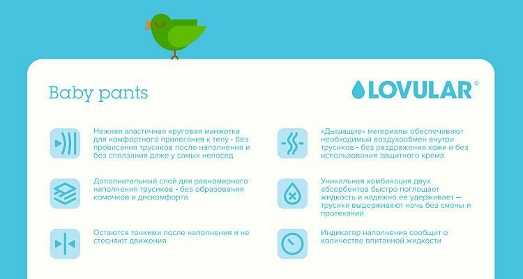 | Плюсы: | Трусики замечательные. Очень хорошо впитывают, не протекают. Не вызывают раздражения. Отсутсвует запах.