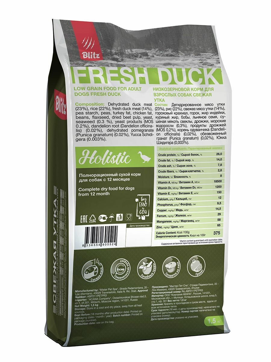 BLITZ HOLISTIC FRESH DUCK низкозерновой корм для взрослых собак всех пород, Утка 1,5кг.