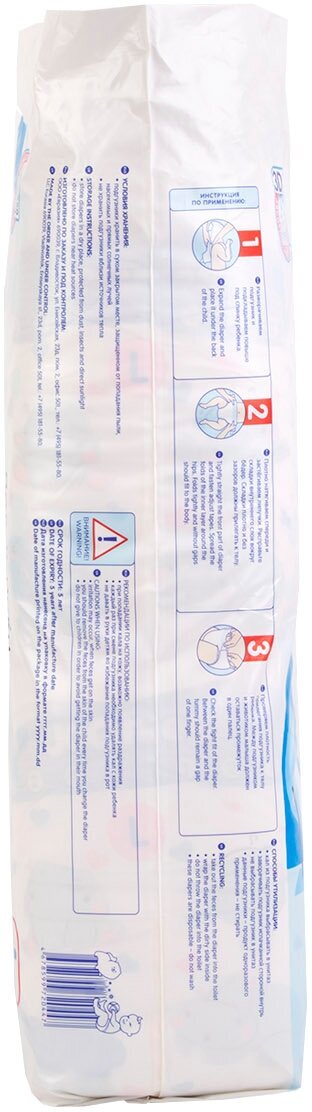 | Дополнительная информация | инструкция по применению:развернуть подгузник и подложить повыше под спинку ребенка, плотно натянуть спереди и застегнуть липучки, расправить складки внутреннего слоя вокруг бёдер, складки плотно и без зазоров должны прилегать к телу, проверить плотность прилегания подгузника к телу ребенка, между подгузником и животиком малыша должен оставаться промежуток в один палец; необходимо перейти на другой размер если подгузник стал тугим вокруг ножек или живота, увеличился объем мочи, не хватает длины подгузника - пупок выглядывает из под подгузника, липучка застегивается в самом крайнем положении |