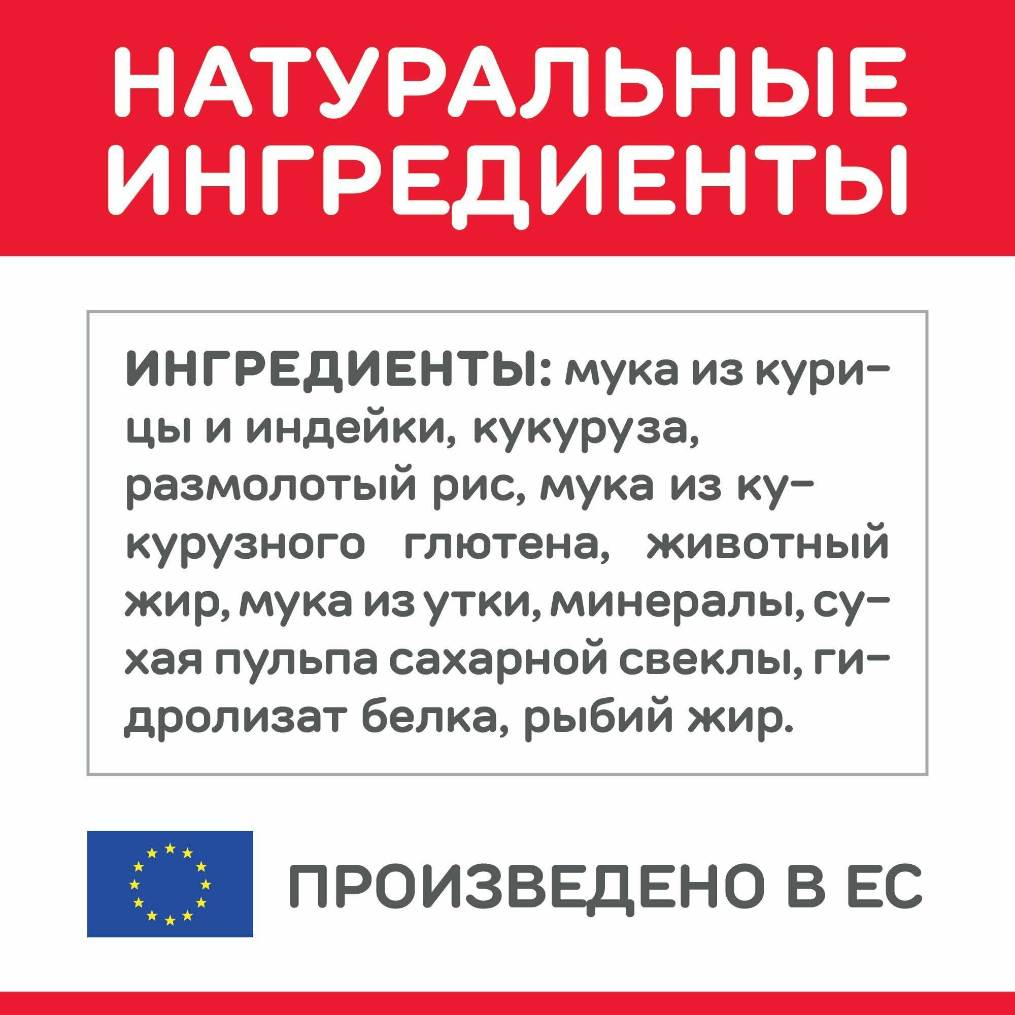 | Состав | мука из курицы и индейки, пшеница, кукуруза, размолотый рис, мука из кукурузного глютена, животный жир, мука из утки, минералы, сухая пульпа сахарной свеклы, гидролизат белка, рыбий жир |