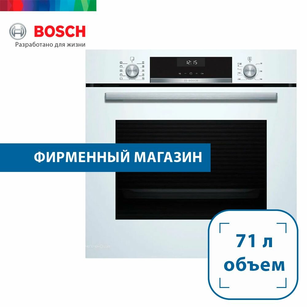 BOSCH Встраиваемая электрическая духовка BOSCH Serie 6, духовой шкаф, белый, 7 режимов, 2-х слойное остекление, LCD-дисплей, утапливаемые переключатели, галогенное освещение, 10 автопрограмм, дверца с амортизатором SoftClose, телескопические направляющие