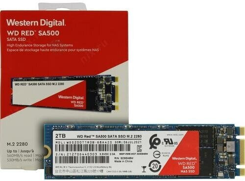 WD SSD Red SA500 NAS, 2.0TB, M.2(22x80mm), SATA3, R/W 560/530MB/s, IOPs 95 000/85 000, TBW 1300, DWPD 0.4 (12 мес.)
