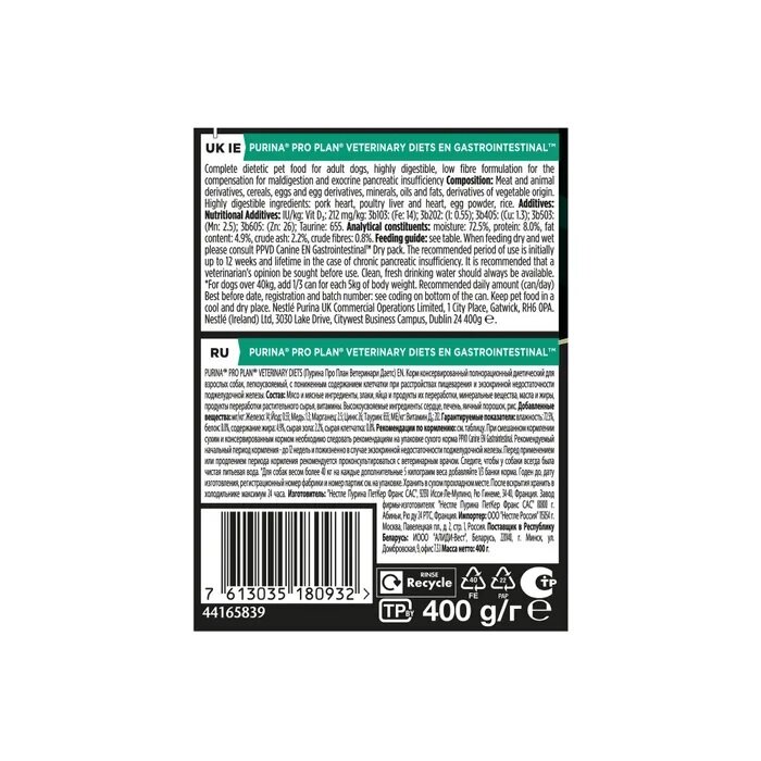 Purina PRO PLAN VETERINARY DIETS EN Gastrointestinal при расстройствах пищеварения и экзокринной недостаточности поджелудочной железы, паштет 400 г
