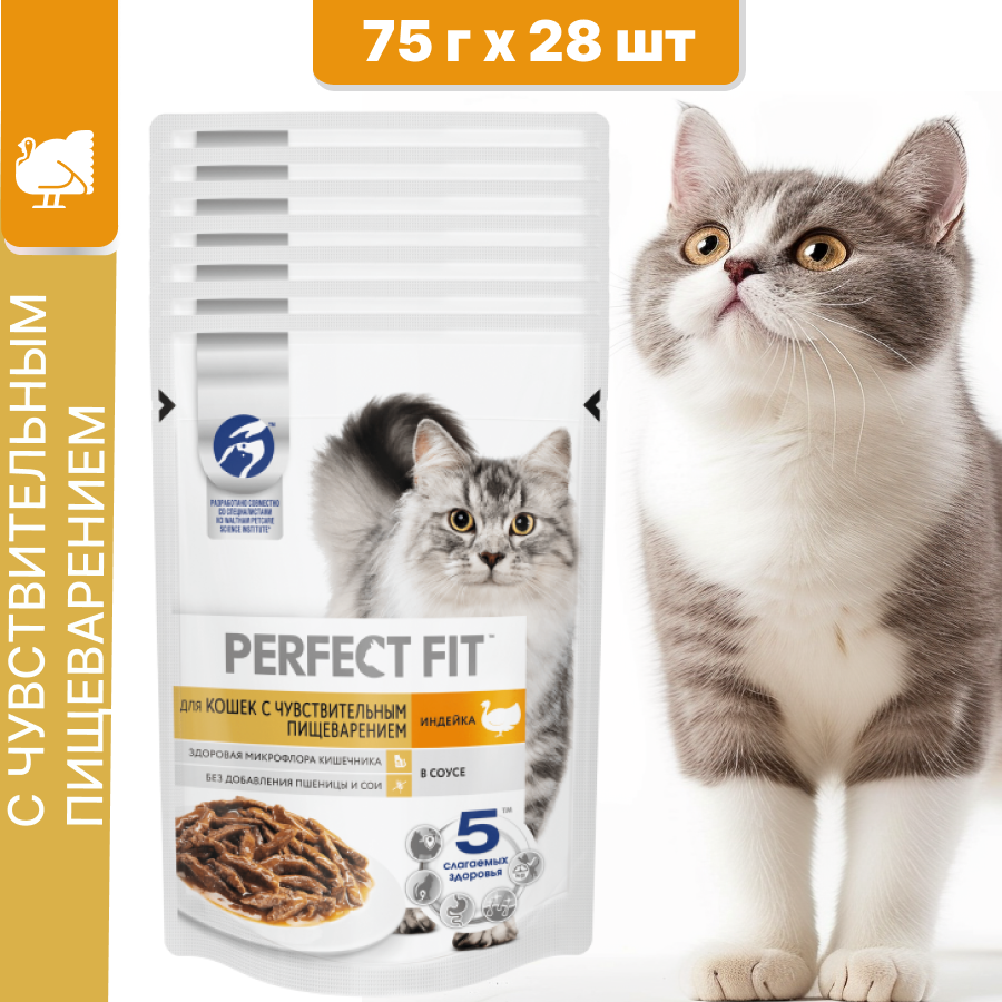 Perfect Fit пауч для взрослых кошек с чувствительным пищеварением (кусочки в соусе) Индейка, 75 г. упаковка 28 шт