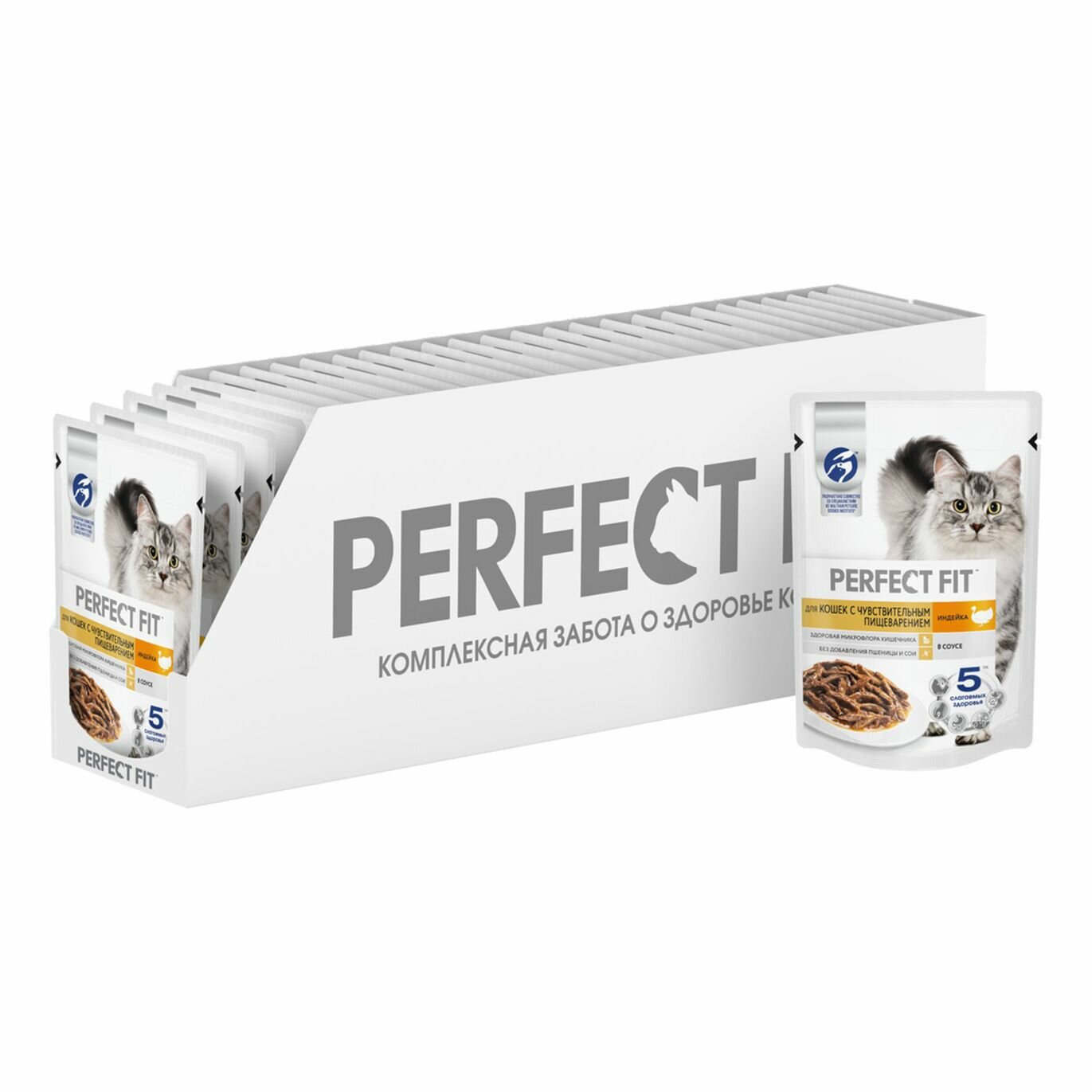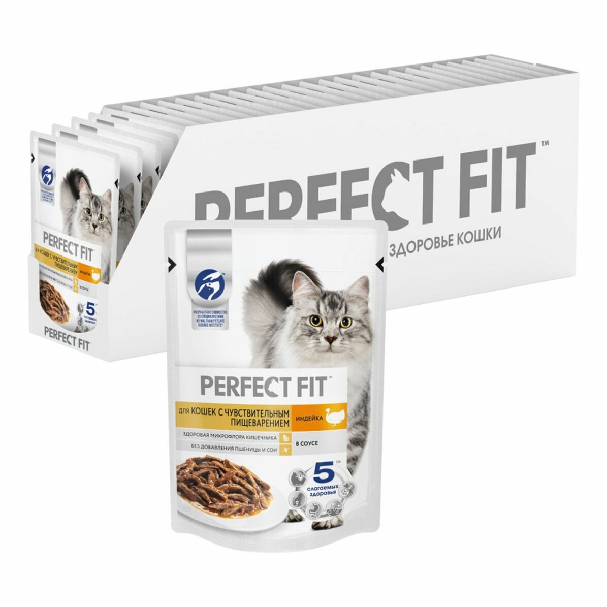 Влажный корм для кошек Perfect Fit при чувствительном пищеварении, с индейкой 85 г (кусочки в соусе)