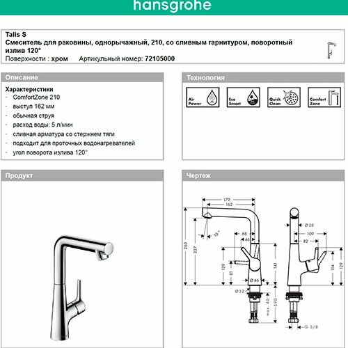 Hansgrohe 72105000 Talis S Смеситель для раковины, сливной гарнитур, хром
