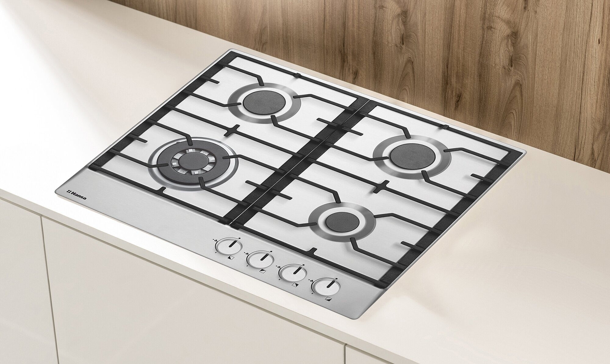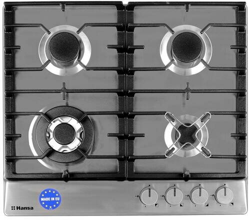 Газовая варочная панель Hansa BHGI611391, встраиваемая, 60 см, газ-контроль и автоподжиг, конфорка повышенной мощности, чугунные решетки, нержавеющая сталь