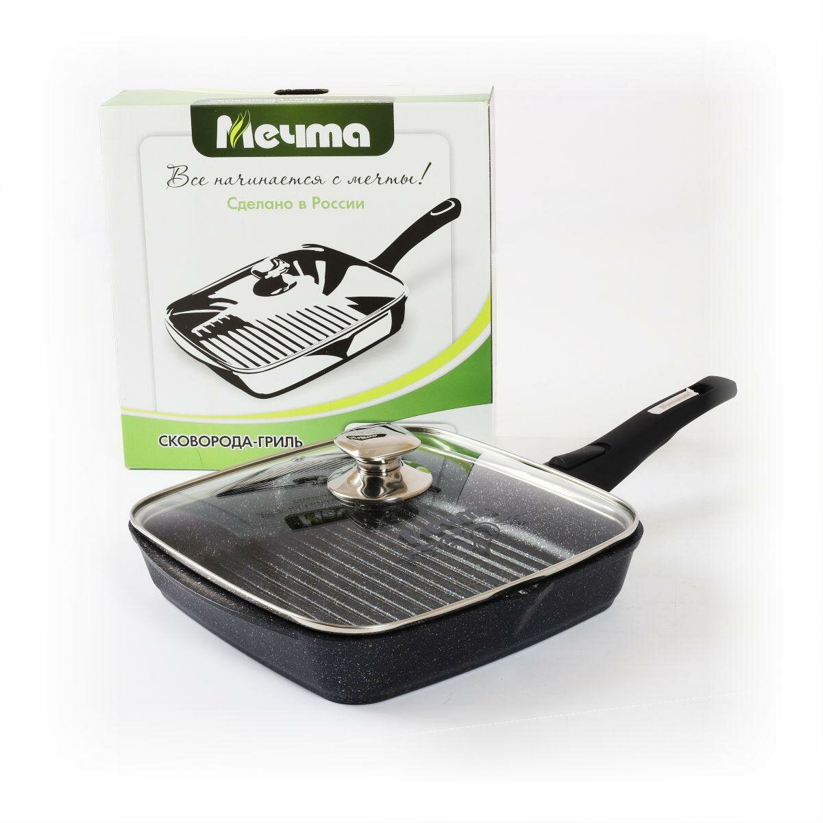Сковорода гриль Мечта квадратная 28х28 см Гранит с антипригарным покрытием со съемной ручкой и крышкой, НЕ индукционная