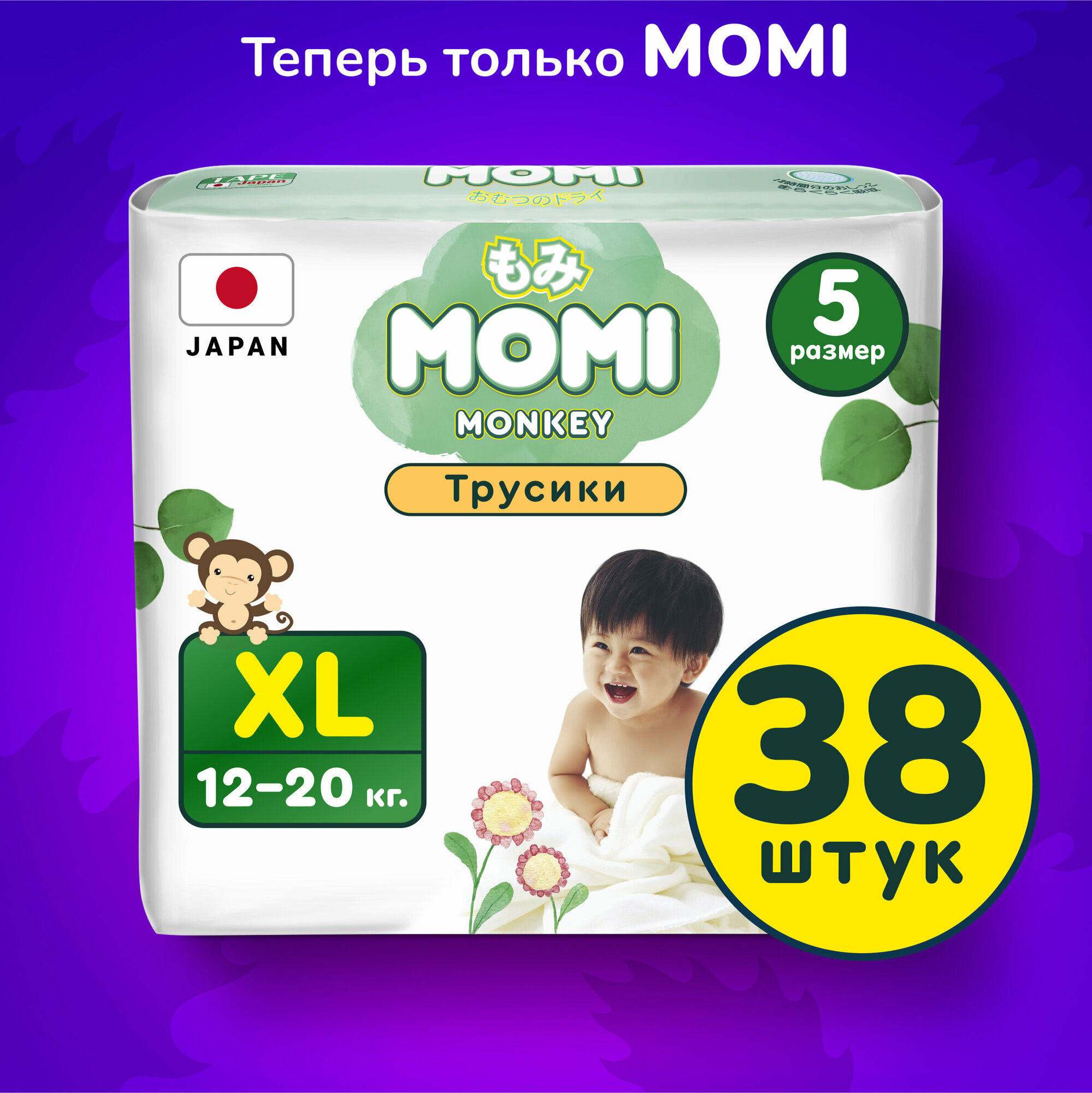 Momi MONKEY японские подгузники трусики детские 12-20кг, размер 5 XL, 38шт