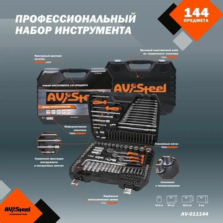 AVSTEEL AV011144 Набор инструмента AV Steel 144 предм. 14,38,12 профессион.