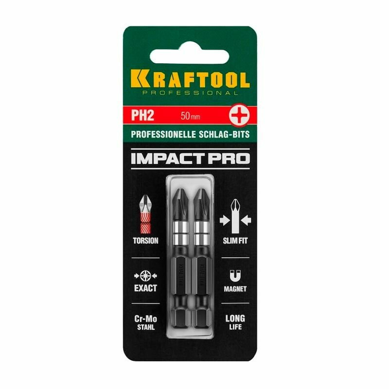 KRAFTOOL Биты KRAFTOOL Impact Pro, Philips, тип хвостовика E 1/4", PH2, 50мм, 2шт, на карточке ( 26191-2-50-S2 )