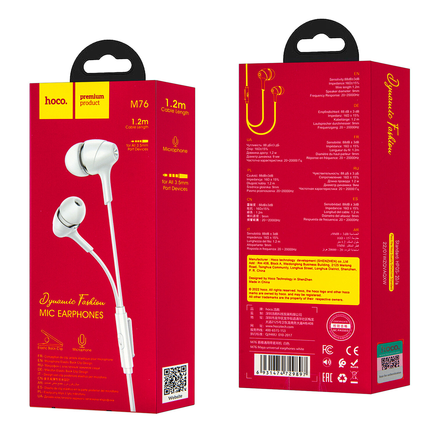 Наушники M76 Maya universal earphones, HOCO, вакуумные с микрофоном, белые