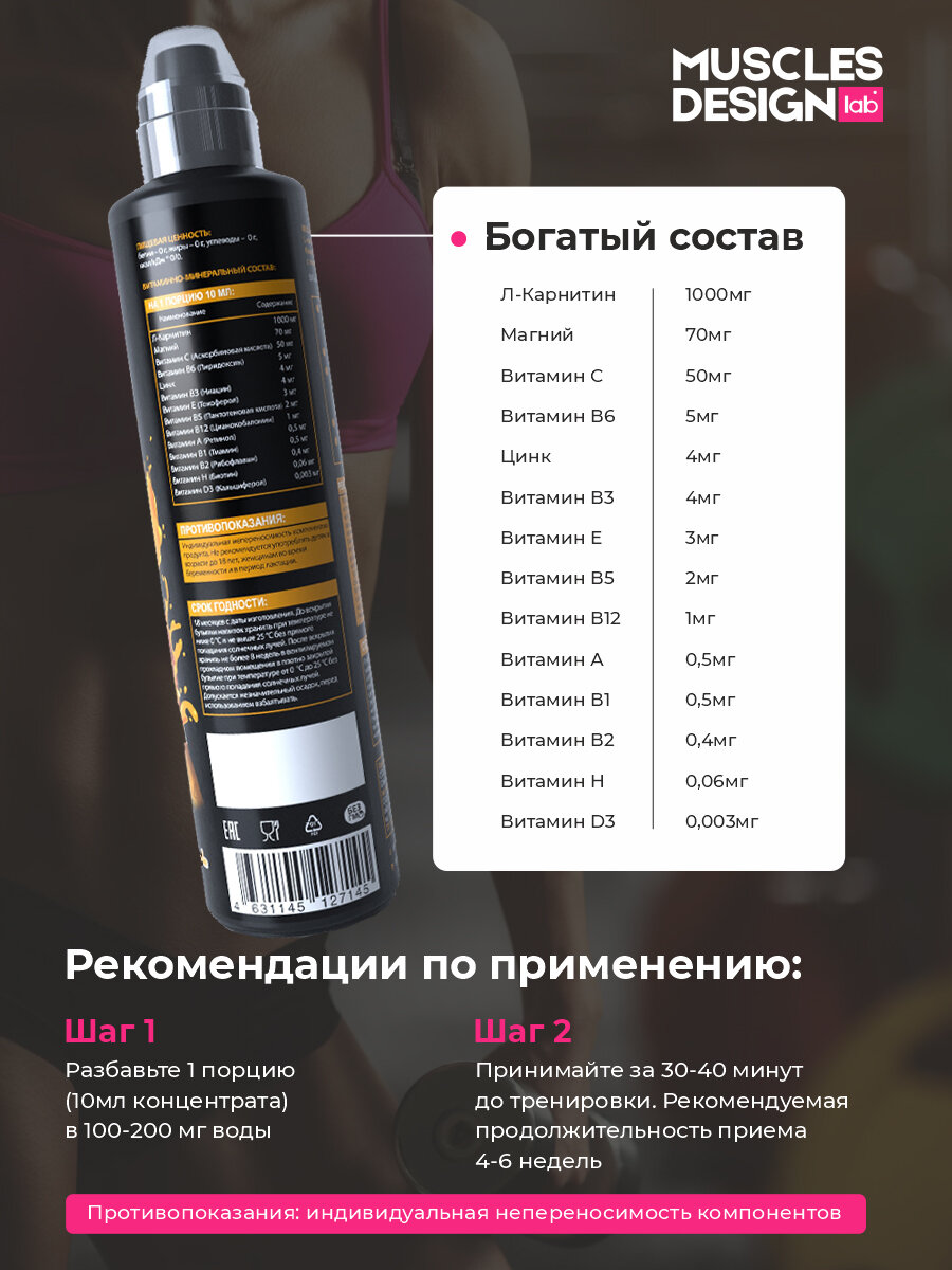 | Дополнительная информация | состав: Столовая минеральная вода, л-карнитин, витаминно-минеральный комплекс, регулятор кислотности, лимонная кислота, концентрированный лимонный сок, подсластители сахарин и цикламат, ароматизатор, загуститель пищевая целлюлоза, консерванты бензоат натрия и сорбат калия, СО² — экстракты (семян сельдерея, имбиря, бадьяна, розмарина).; рекомендации по применению: принимайте по 10 мл, используя мерный колпачок на бутылке, запивая водой или любимым напитком. Либо для получения готового напитка разбавьте порцию 10 мл концентрата в 150-200мл воды или сока. Принимать за 30-40 минут до тренировки. |