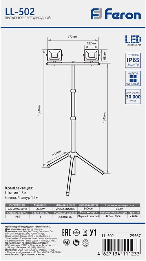 Прожектор светодиодный переносной на штативе, (до) LL-502, 2*30W, 6400К 230V/50Гц, 5400Lm, IP65, 120°, 670*500*1660мм