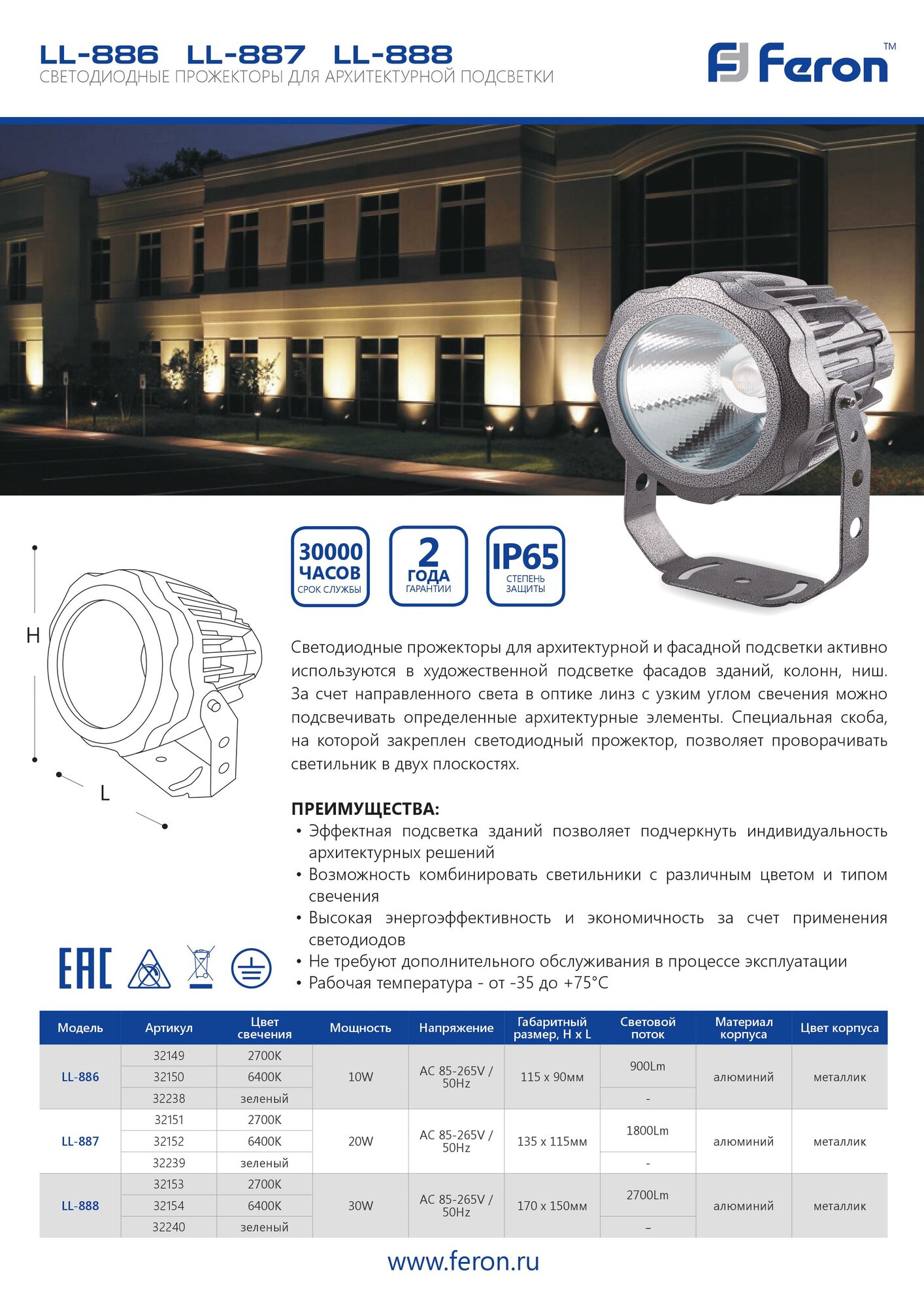 Feron LL-888 Прожектор ландшафтно-архитектурный светодиодный, на кронштейн (до) , 30W, 6400К, 32154