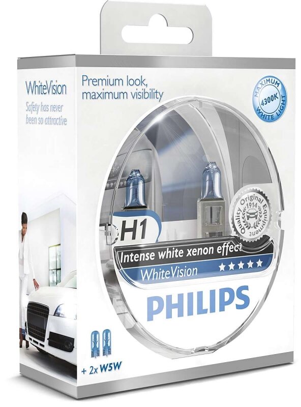 Лампы H1 12V 55W 4300K Whitevision + W5w 12V (2+2Шт) Philips арт. 12258WHVSM