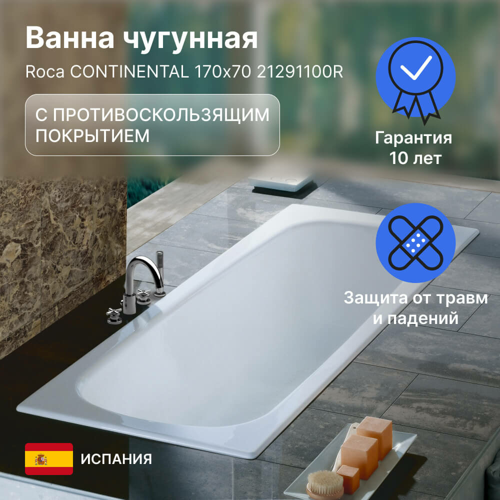 Чугунная ванна Roca Continental 21291100R 170х70, с антискользящим покрытием