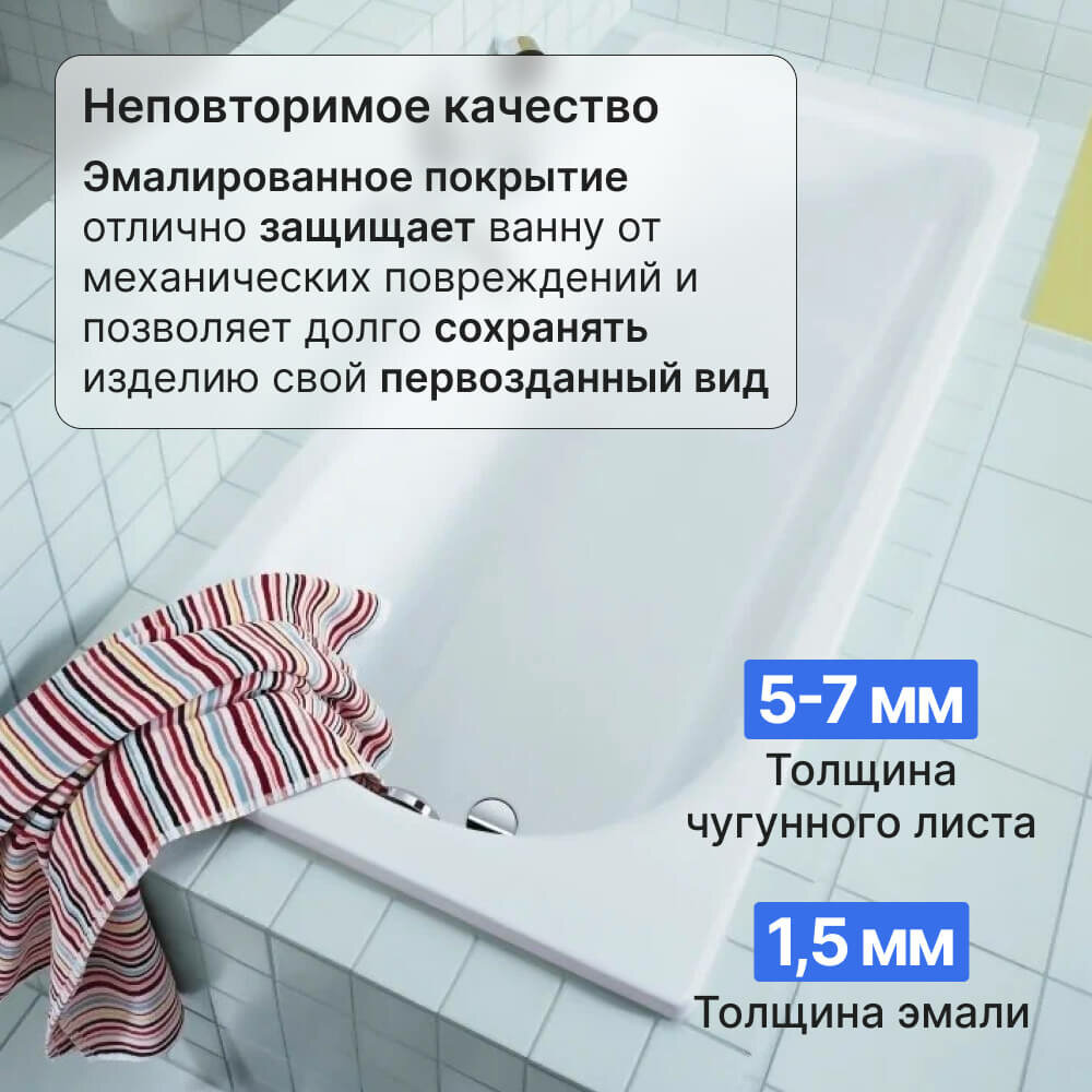Надежная чугунная ванна Приятный внешний вид Идеально белая эмаль Антискользящее покрытие Приятная форма, объем, комфортный размер ванны Ровная, гладкая |