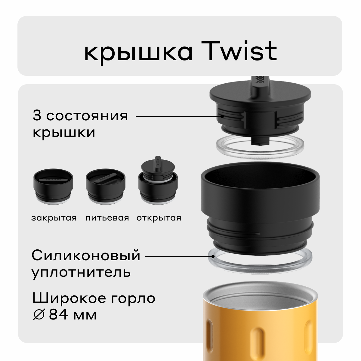 | Дополнительная информация | крышка Twist имеет три положения: 1. питьевая - прокрутите до щелчка, чтобы пить как из кружки; 2. открытая - сделайте два оборота, чтобы вытащить внутреннюю часть крышки; промойте Tumbler водой и залейте новый напиток; 3. закрытая - в таком положении температура напитка сохраняется максимально долго. Tumbler c закрытой крышкой на 100% герметичен. |