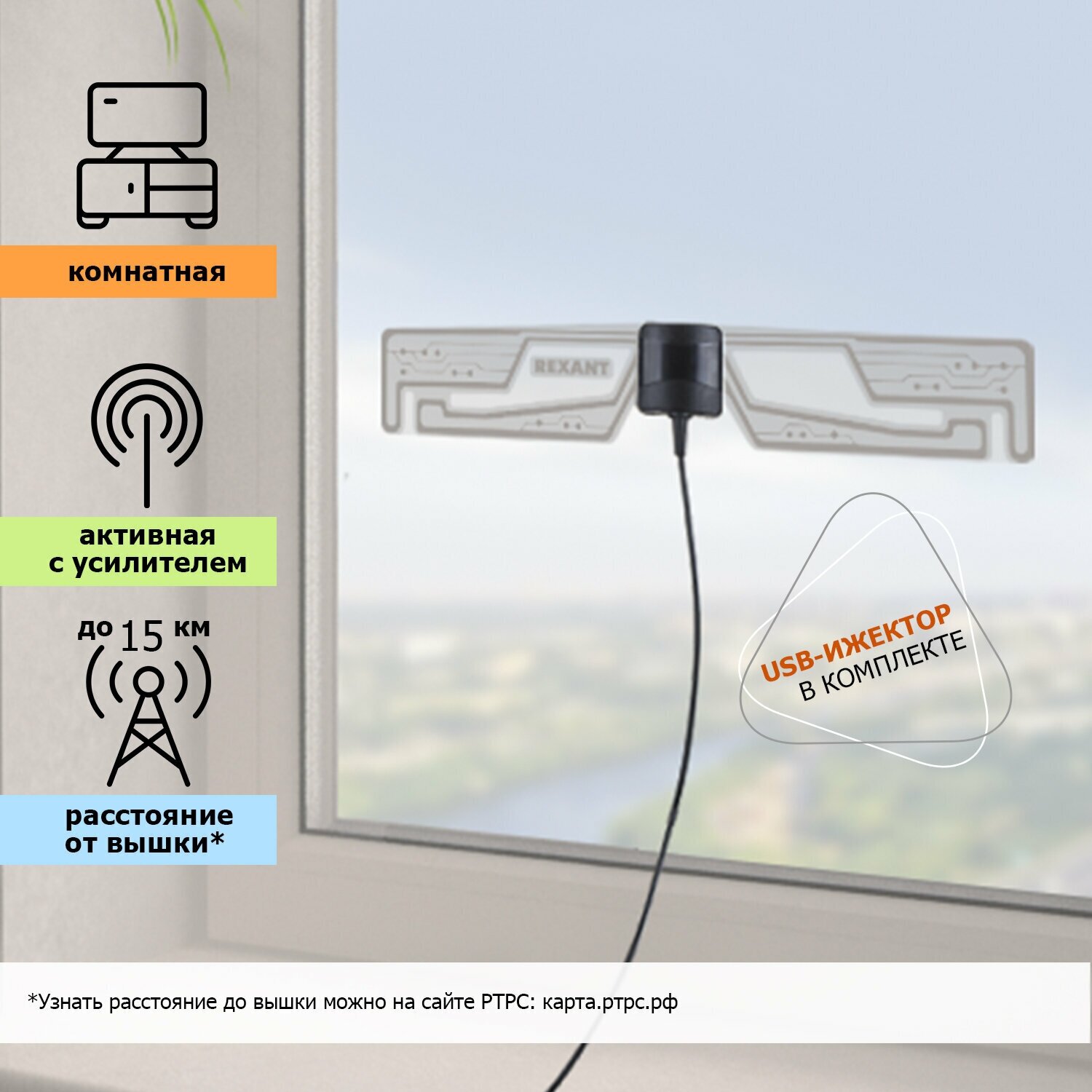 Купить Антенна комнатная Rexant 707 "Активная" с USB питанием для цифрового телевидения DVB-T2 до 15 км .