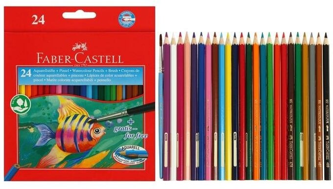 Карандаши акварельные 24 цвета Faber-Castell Рыбки (L=175мм, D=7мм, d=3мм, 6гр) + кисть, картонная упаковка (114425)