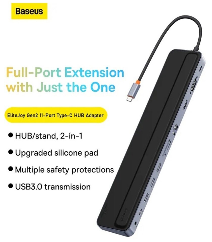 Хаб для Macbook Baseus EliteJoy Gen 2 11 в 1 Type-C to HDMI 4K, USB 3.0, PD, VGA переходник, картридер SD и TF, RJ45,3.5 mm интересное: