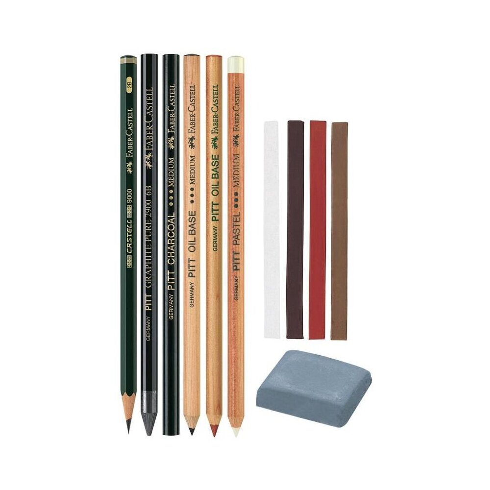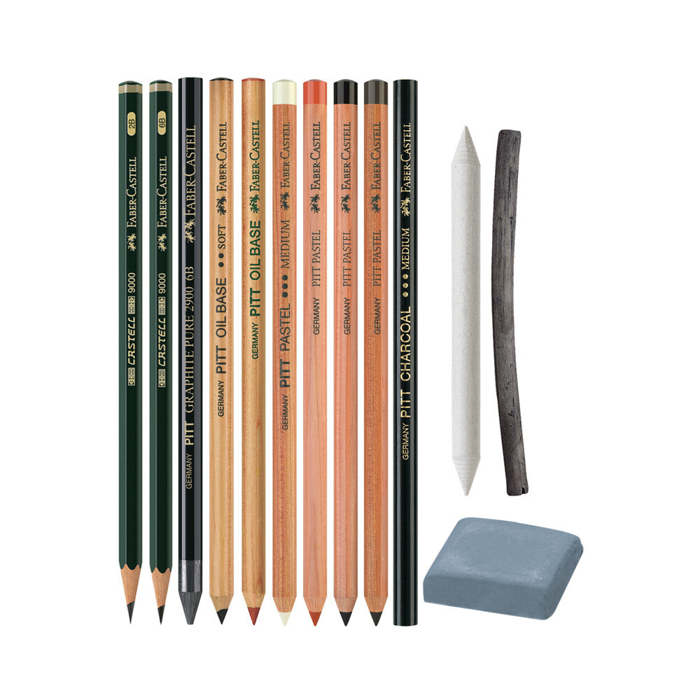 | Подробная комплектация | - 2 чернографитных карандаша Castell 9000 2B, 6В; - угольный карандаш Pitt Graphite Pure 6B; - 2 масляных карандаша Pitt Oil Base artists'; - 4 Pitt Pastel сухих пастельных карандаша; - 6 Pitt pastels сухих пастелей; - Pitt прессованный уголь; - Pitt натуральный уголь; - Pitt натуральный угольный карандаш; - Pitt прессованный угольный карандаш; - ластик клячка; - бумажная салфетка. |