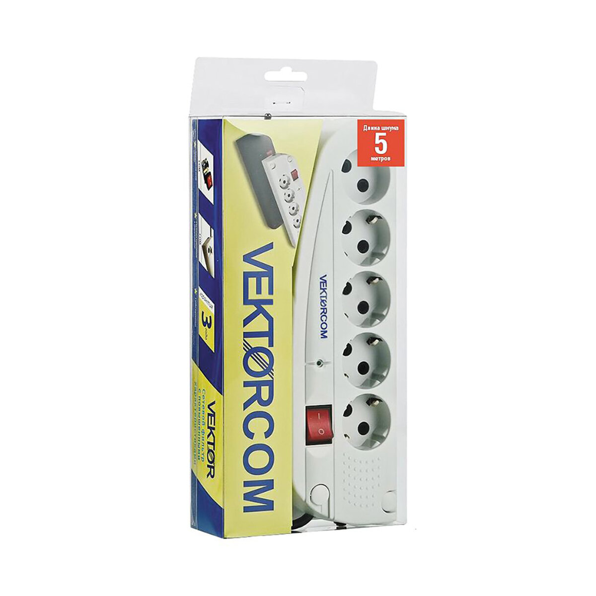 Сетевой фильтр Vektor Com, 2,2 кВт, 10А, 5 розеток (4 с заземлением), 5 м, светло-серый