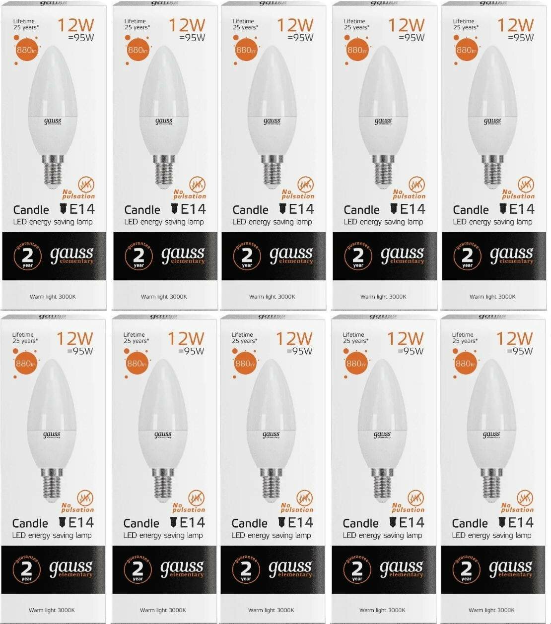 Лампочка светодиодная E14 Свеча 12W теплый свет 3000К упаковка 10 шт. Gauss Elementary