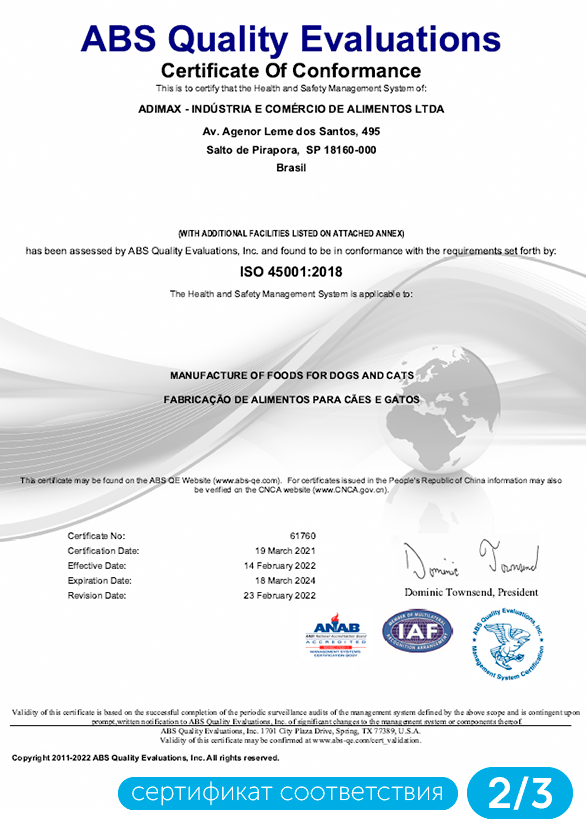 | Состав | Мука из мяса курицы, дробленый рис, пшеничные отруби, куриный жир, масло лосося, семена льна, натуральный усилитель вкуса, обезвоженные фрукты и овощи (манго, яблоко, морковь, томаты), свекольный жом, хлорид натрия, мука из морских водорослей Schizochytrium sp., пребиотики (маннанолигосахариды, фруктоолигосахариды и инулин), экстракт Юкки Шидигера (Yucca schidigera) (0,04%), хондроитина сульфат (0,01%), глюкозамина сульфат (0,03%), витамины (A, D3, E, K3, C, B1, B2, B6, B12, биотин, пантотенат кальция, фолиевая кислота, ниацин, хлорид холина), минералы (железо, медь, кальций, калий, цинк, марганец, селен, натрий), гексаметафосфат натрия, пропионовая кислота, экстракты растений (зеленый чай, розмарин, мята), экстракт токоферола (природный антиоксидант) (0,01%). |