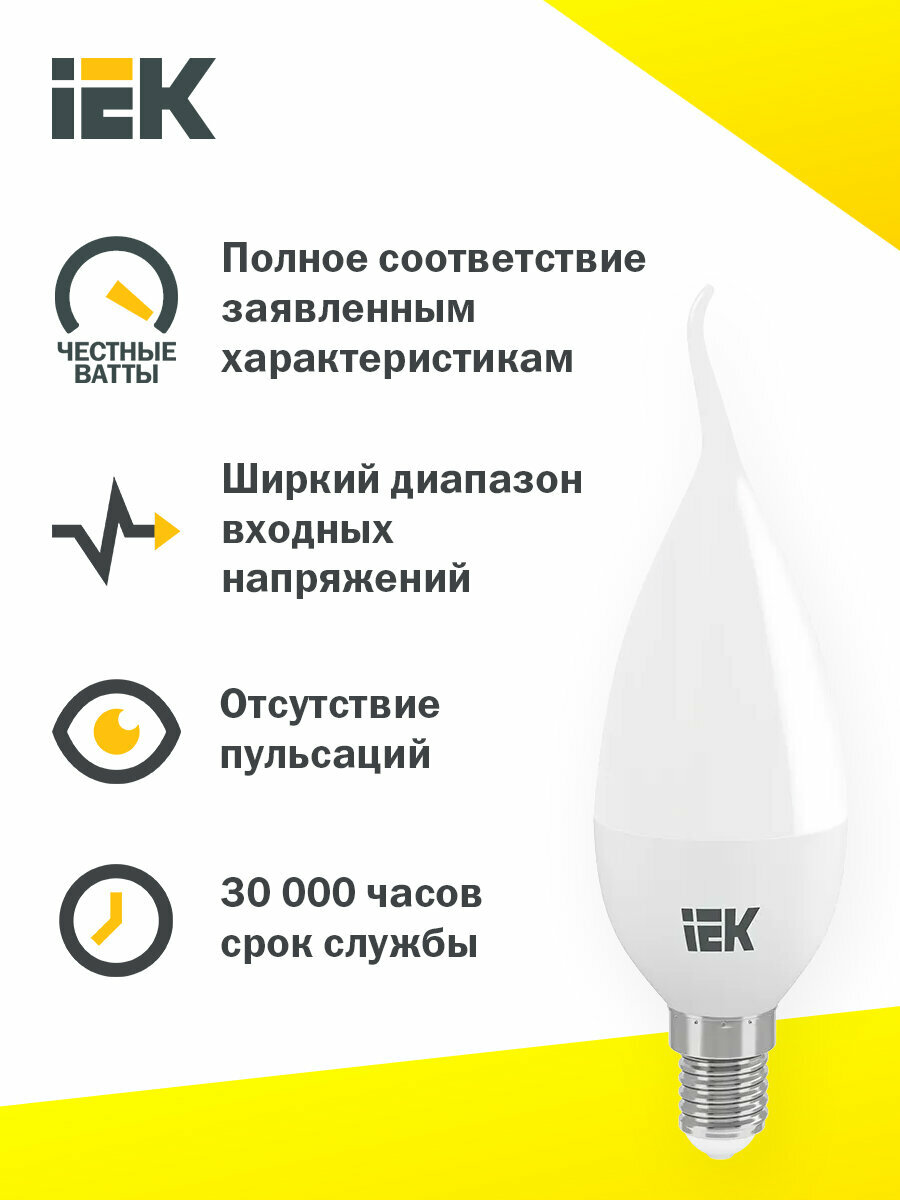 Светодиодная лампа IEK 7W эквивалент 60W 3000K 630Лм E14 свеча на ветру (комплект из 5 шт.)