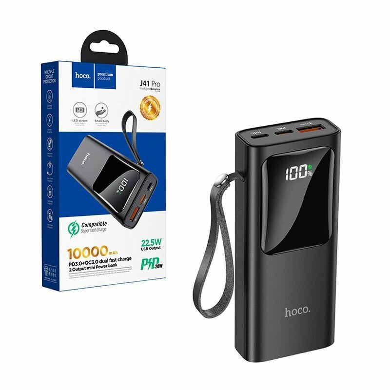 Универсальный Доп. Аккумулятор 10000mAh, J41 Pro, с диcплеем, HOCO, выход 1 USB (22,5W), 1 PD (20W), вход 1 PD, черный