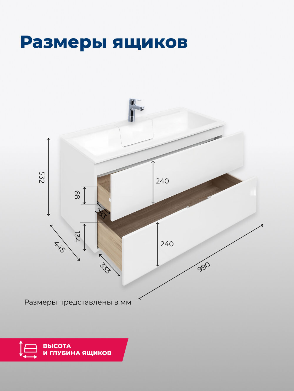 | Комплектация | Тумба под раковину, 2 выдвижных ящика, раковина в комплект не входит |