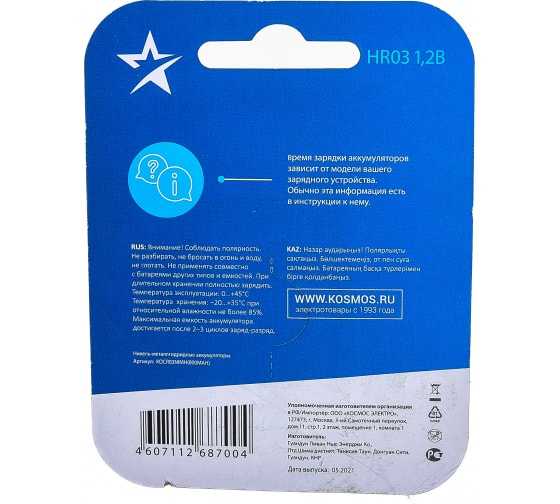 Купить Ак-р Космос /R03 800mAh Ni-MH BL2