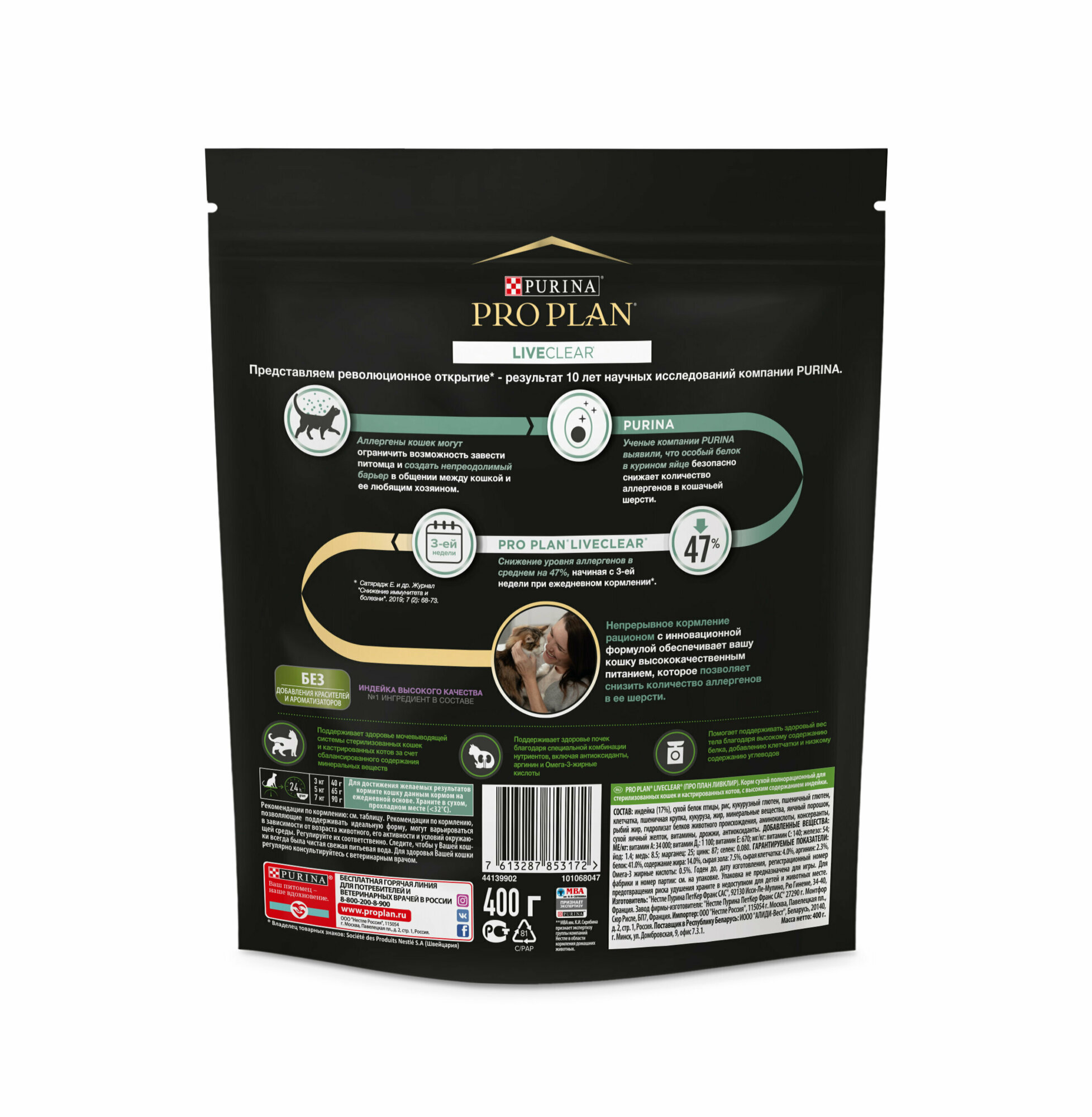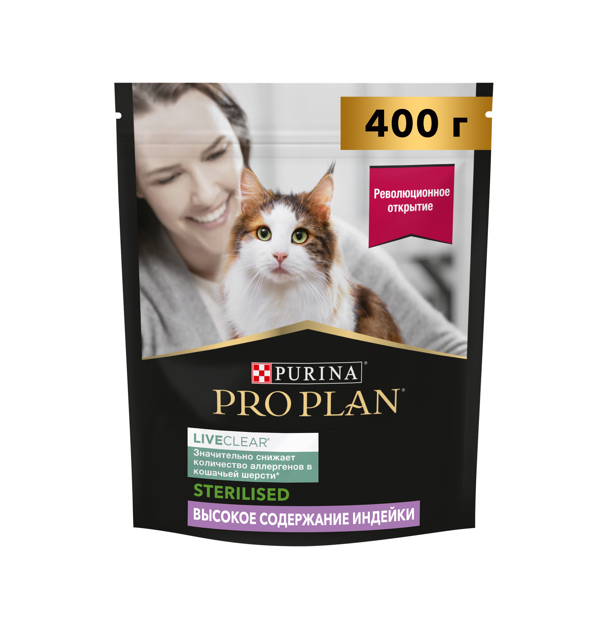 Сухой корм Pro Plan® LiveClear® для взрослых стерилизованных кошек, снижает количество аллергенов в шерсти, с индейкой, Пакет, 0,4 кг