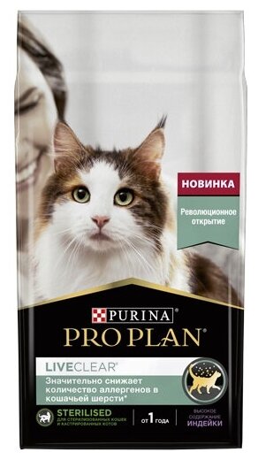 Сухой корм Pro Plan® LiveClear для стерилизованных кошек, снижает количество аллергенов в шерсти, с индейкой, пакет, 1,4 кг