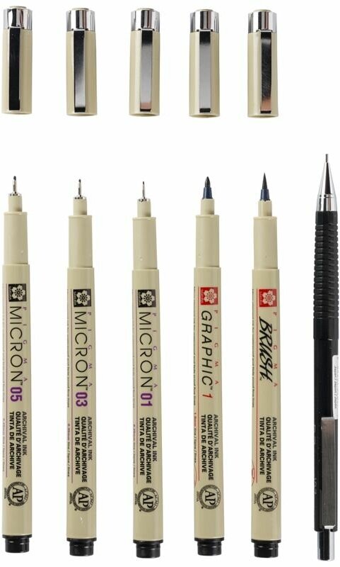 Набор капиллярных ручек Sakura Pigma Micron Manga, 6 штук (0.1 мм, 0.3 мм, 0.5 мм, кисть Sakura Pigma Graphic)