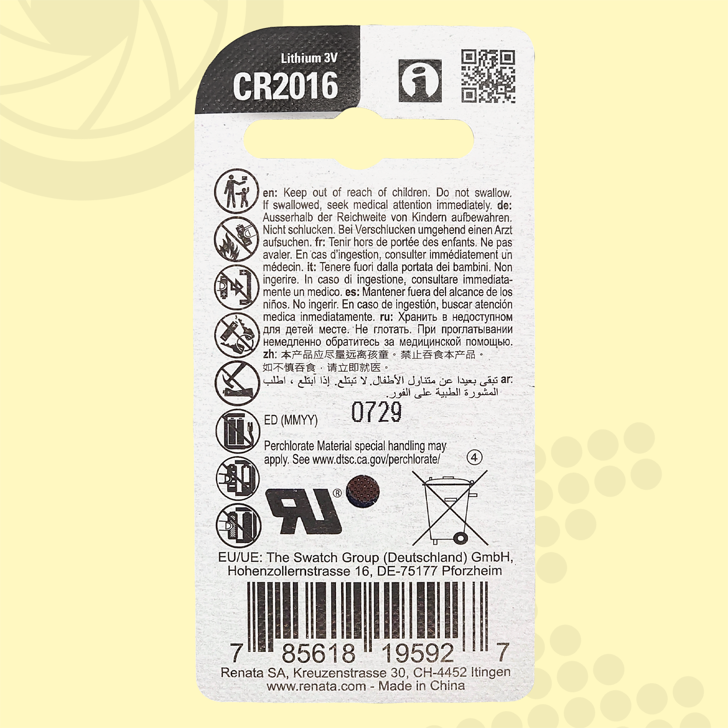 Дисковый элемент питания CR2016 на 3В - CR2016 RENATA (код 14472)
