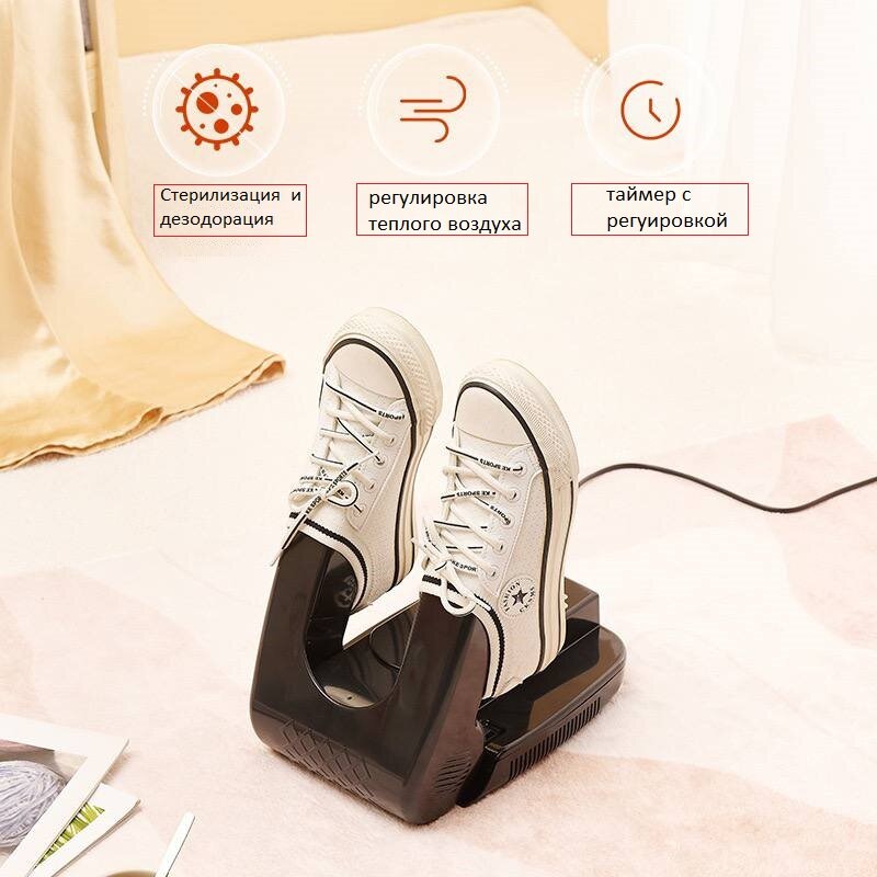 Компактная, много места не занимает. Действительно обувь становится сухой. Есть несколько режимов работы от 5 мин до 1 час 20 мин. |