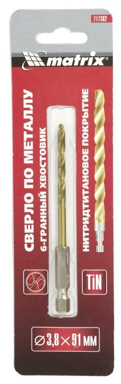 Сверло по металлу, 3.8мм, HSS, нитридтитановое покрытие, шестигранный хвостовик Matrix (717382)