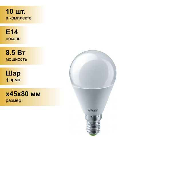 Лампа светодиодная Navigator 61 333, шар, 8.5 Вт, E14, теплый свет 2700К, упаковка 10 шт.