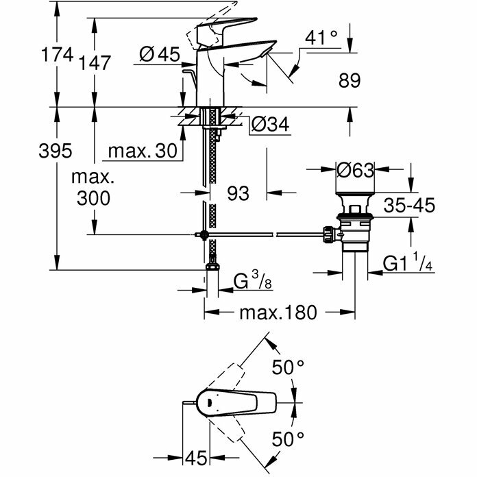Смеситель для раковины GROHE BauEdge с ограничителем температуры и рычажным донным клапаном, размер S, хром (23328001)