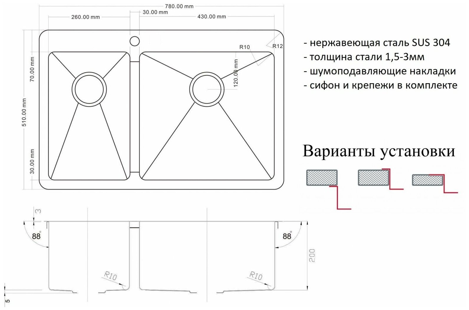 Мойка кухонная ZorG Inox R PVD 78-2-51-R GRAFIT из нержавеющей стали, графит