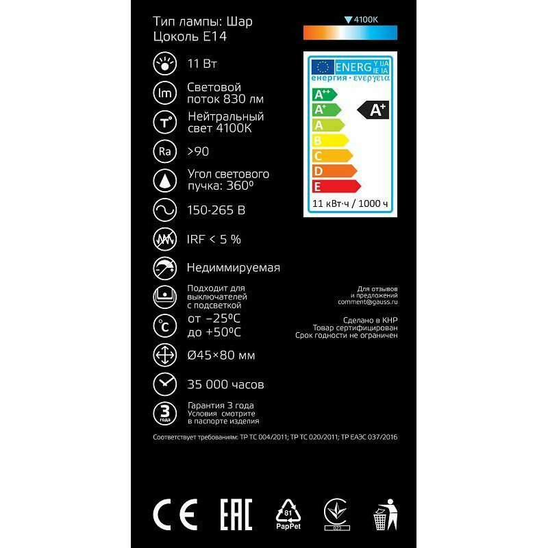 (6 шт.) Светодиодная лампочка Gauss G45 11Вт 150-265В 4100K E14 филамент.