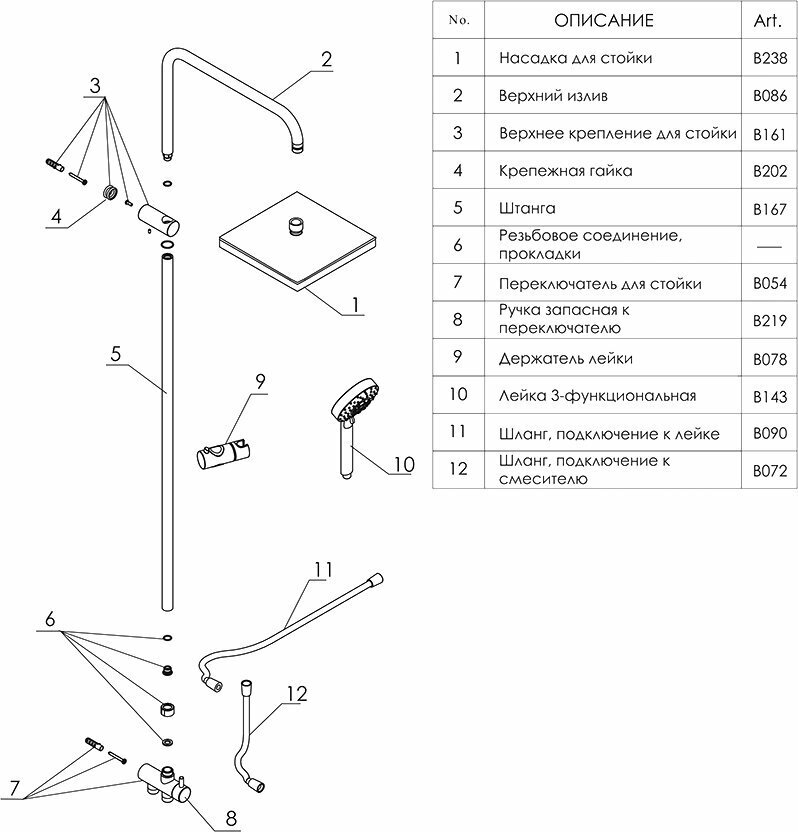 | Комплектация | верхний душ - 1 шт. / стойка для душа - 1 шт. / ручной душ - 1 шт. / шланг для подключения к лейке - 1 шт. / шланг для подключение к смесителю - 1 шт. / керамический поворотный переключатель - 1 шт. / регулируемый держатель лейки - 1 шт. / набор для монтажа - 1 шт. |