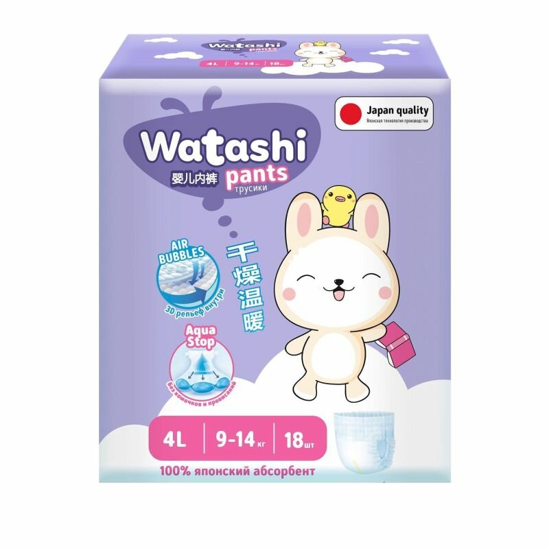 Купить WATASHI Трусики-подгузники для детей, размер 4/L, 9-14 кг, 18 шт