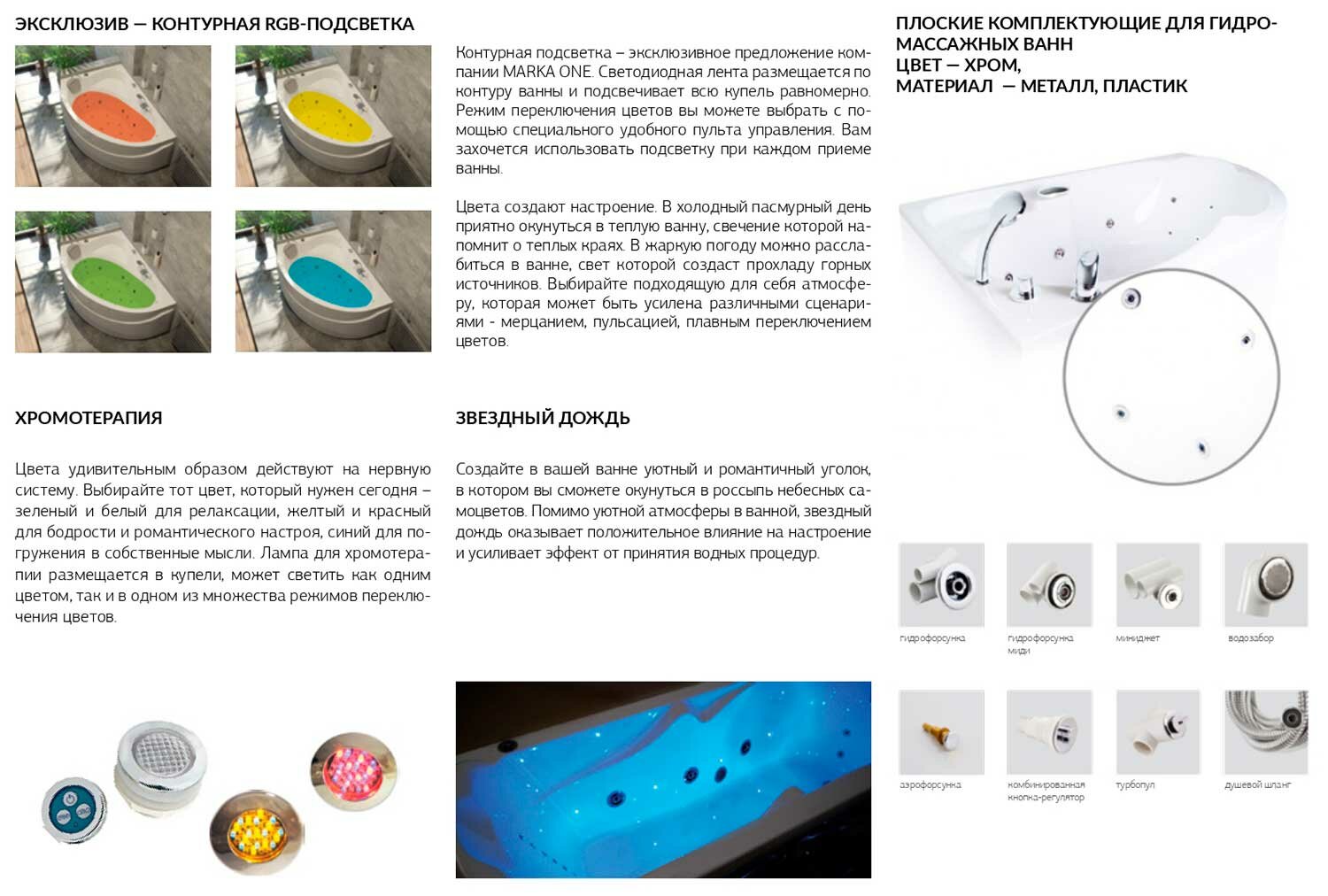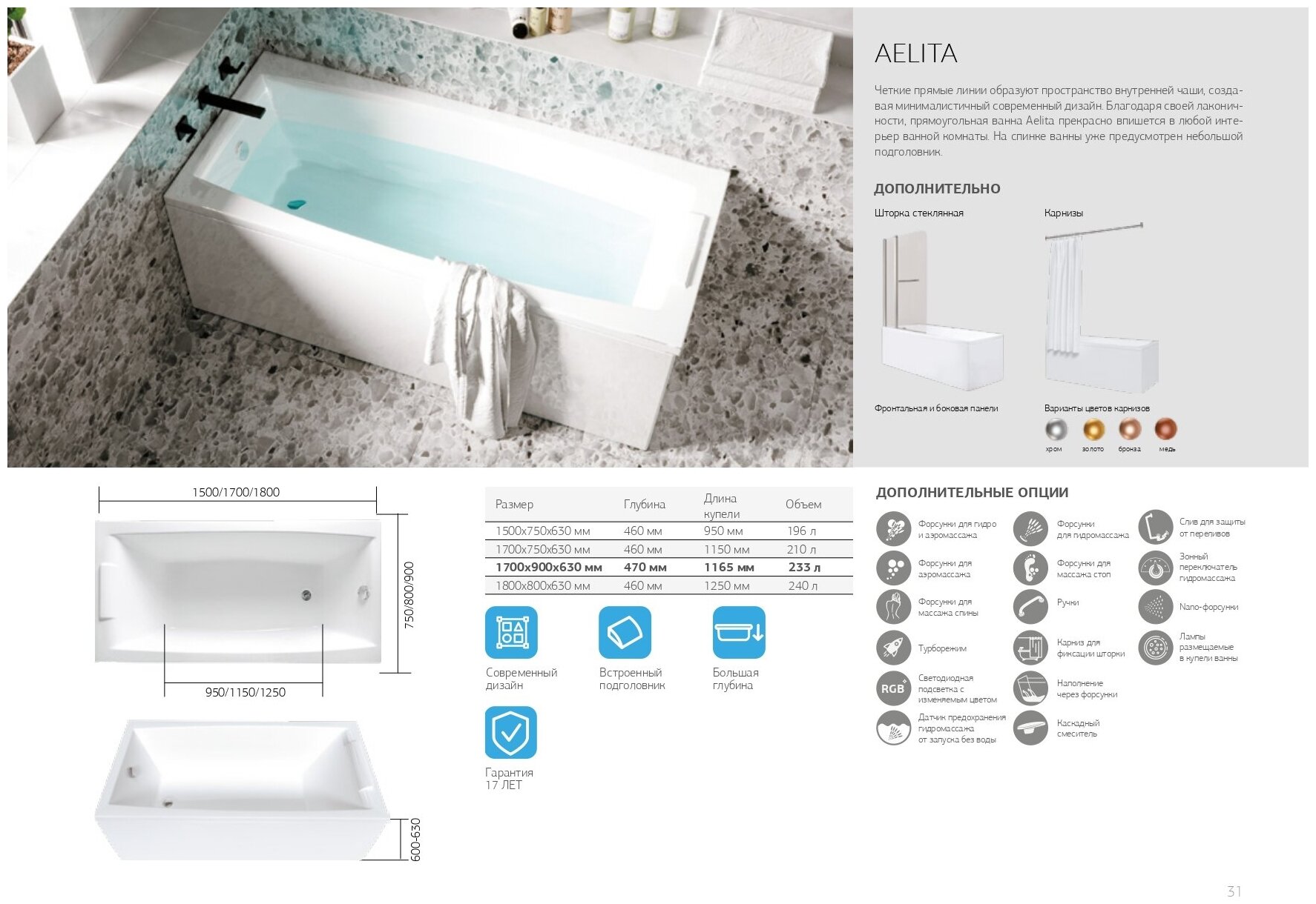 | Дополнительная информация | стандартные опции: панель лицевая/боковая, разборная рама, карниз, смеситель на борт ванны, слив перелив; индивидуальные опции гидромассажа: массаж спины/ног/тела, подсветка, ручки, подголовник, армирование |